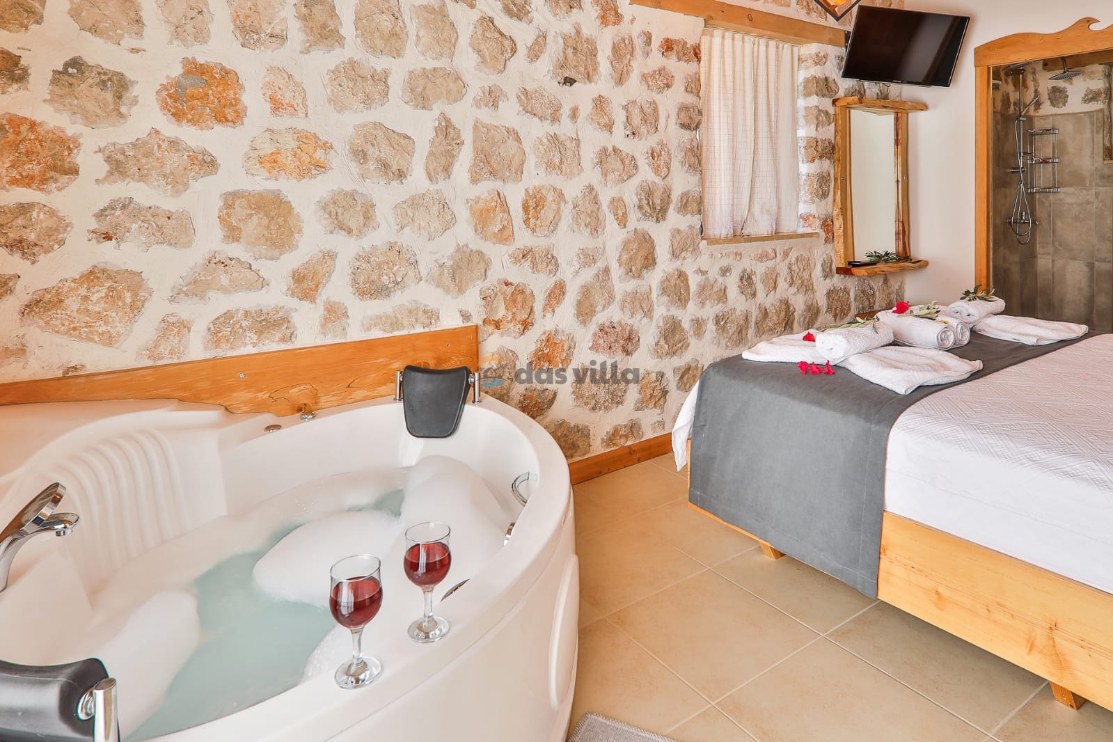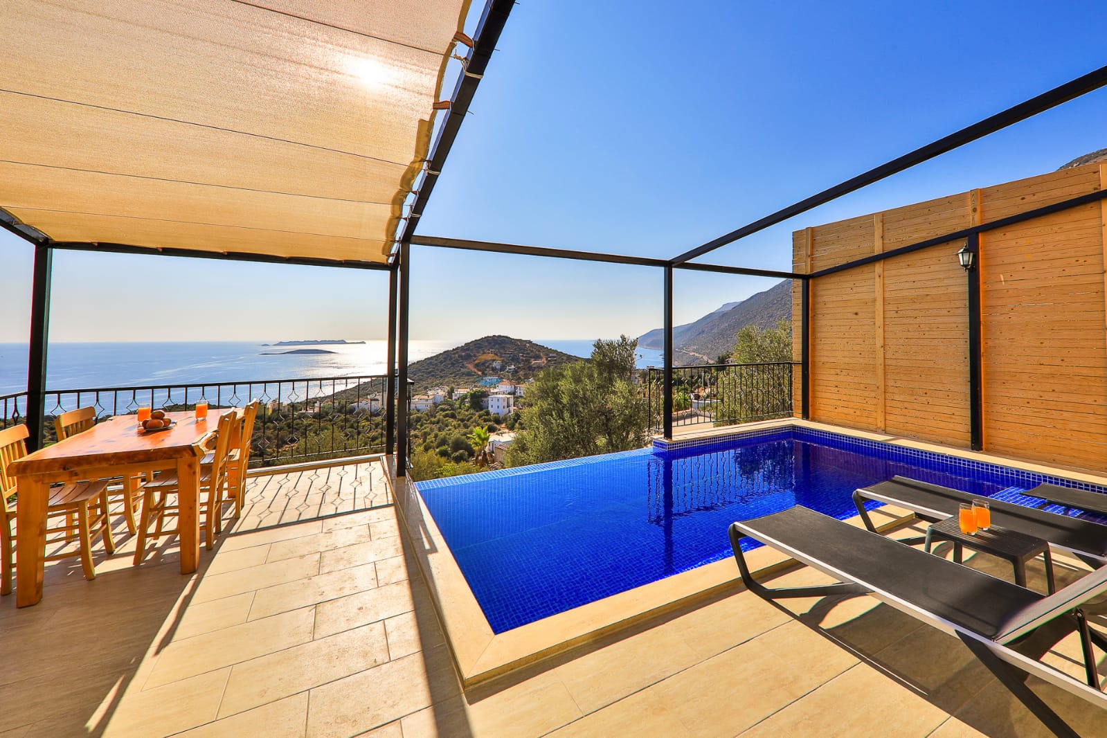 Villa Abosa is located in Kaş Gökseki region. It is a special villa for you with its 2 bedrooms and capacity for 3 people. Thanks to the meticulous luxury decoration and modern design of our villa, you will have enjoyable days and you, our valued customers, will never want your holiday to end. Thanks to our villa's modern kitchen, complete equipment and comfortable items, you will feel like you are at home and have the opportunity to have a comfortable holiday. The sheltered design of our villa's private swimming pool is especially beneficial for the satisfaction of our honeymoon couples and conservative families. In addition, thanks to the jacuzzi and unique sea and island view in our villa with a large garden, you will have the opportunity to relax your soul and body. We are waiting for you, our valued guests, in our villa, which has been designed with every detail considered, which is quite suitable for your family and honeymoon couples.