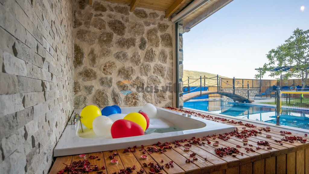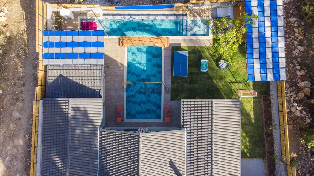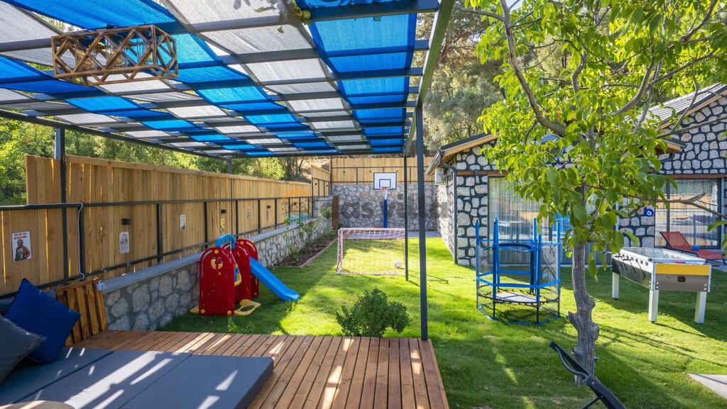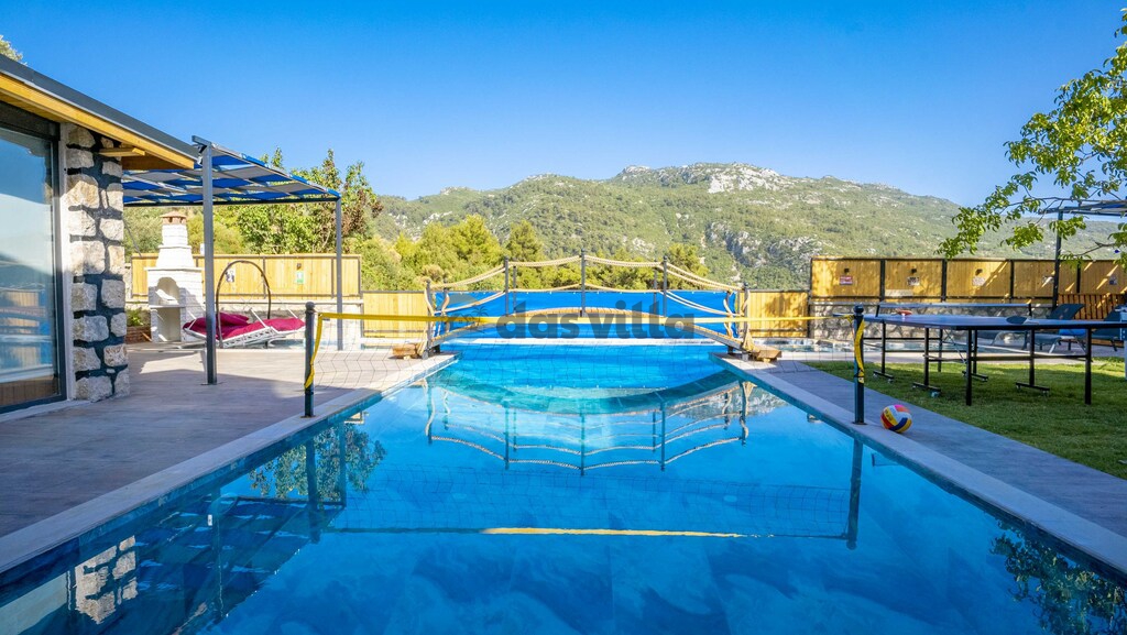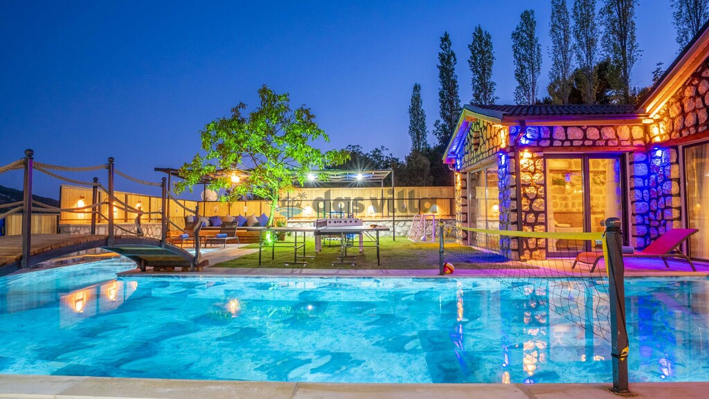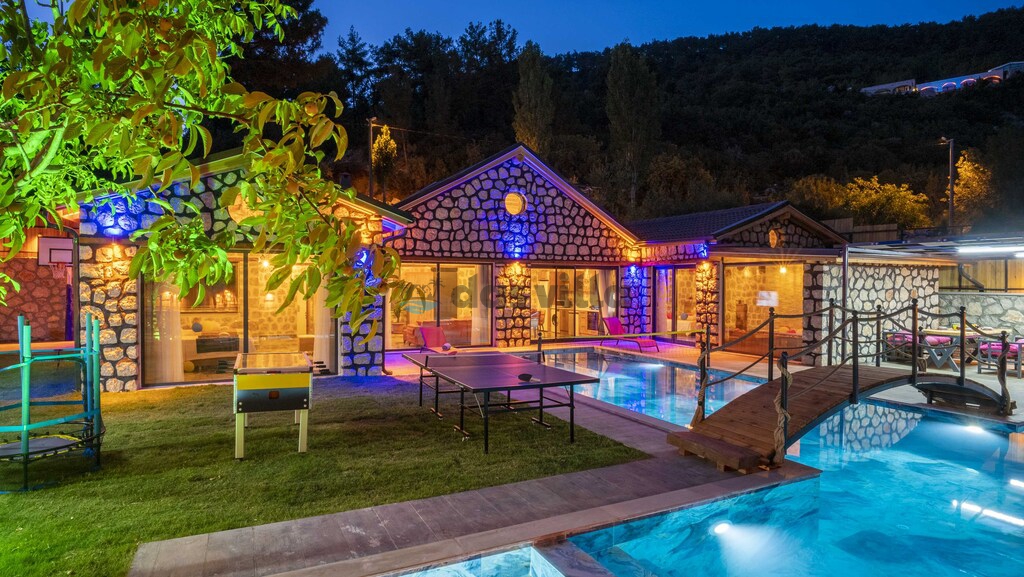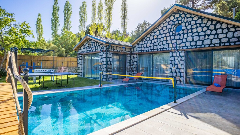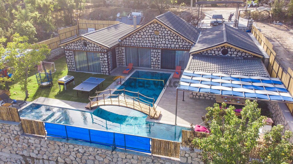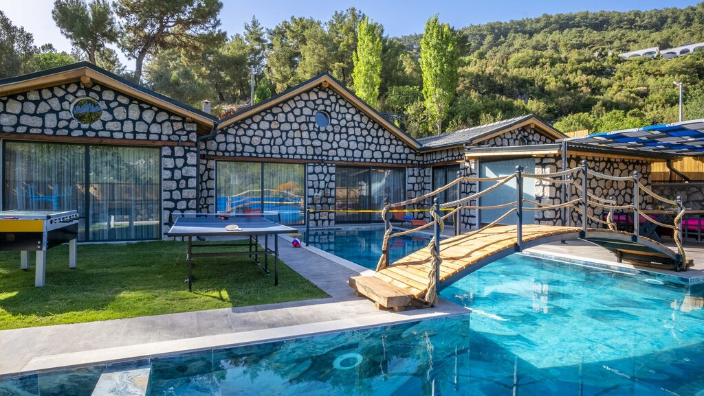The pool terrace of our villa is quite large and offers many alternatives such as a uniquely beautiful pool bridge, table tennis, table football, and green areas. We are waiting for you, our valued guests, in our carefully designed villa for you to have a nice holiday with your family or groups of friends.