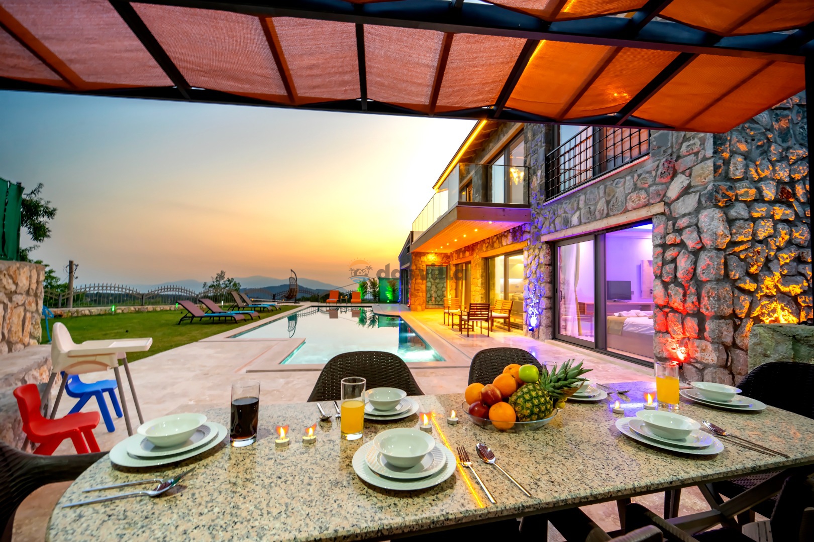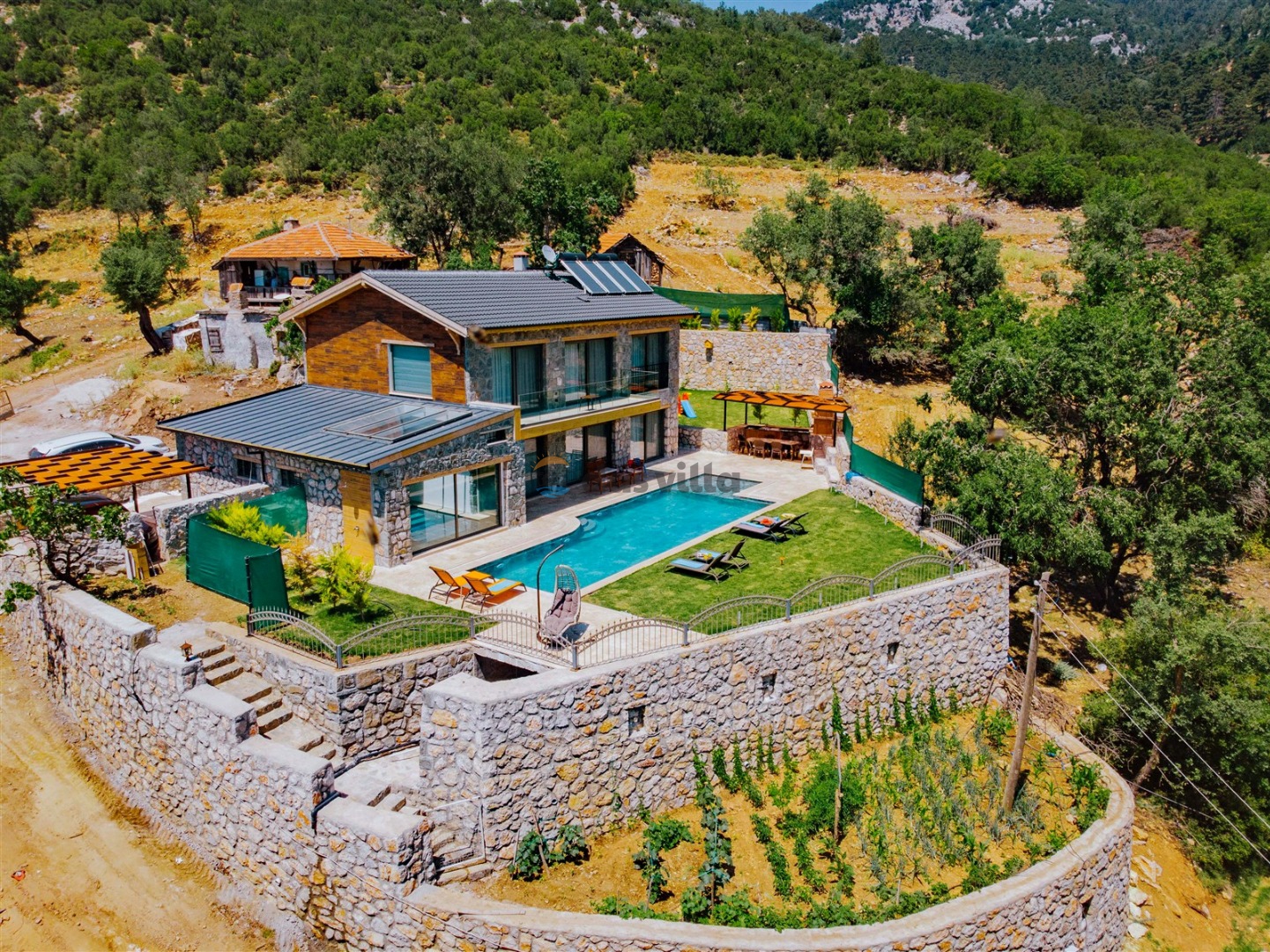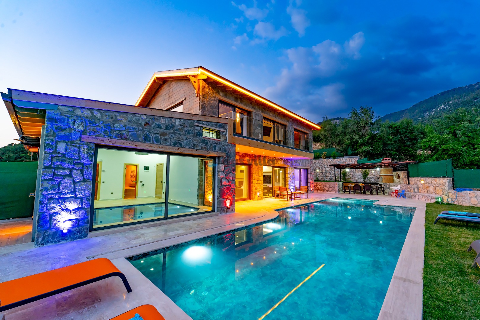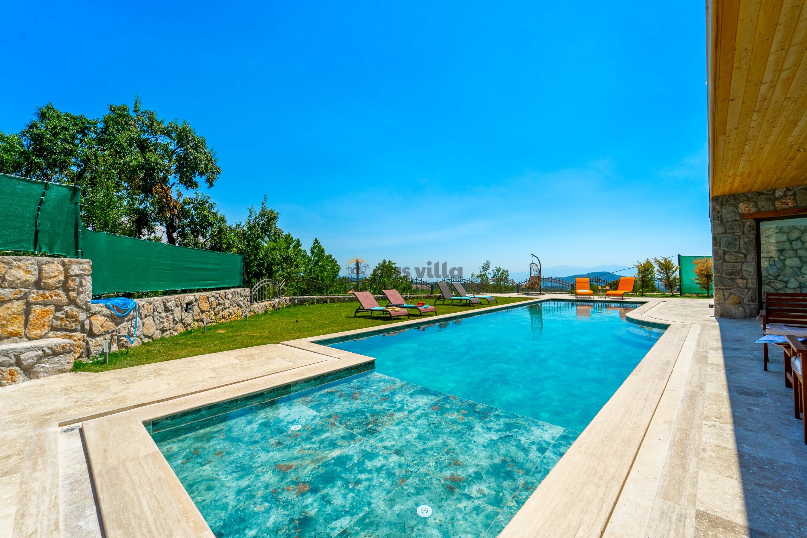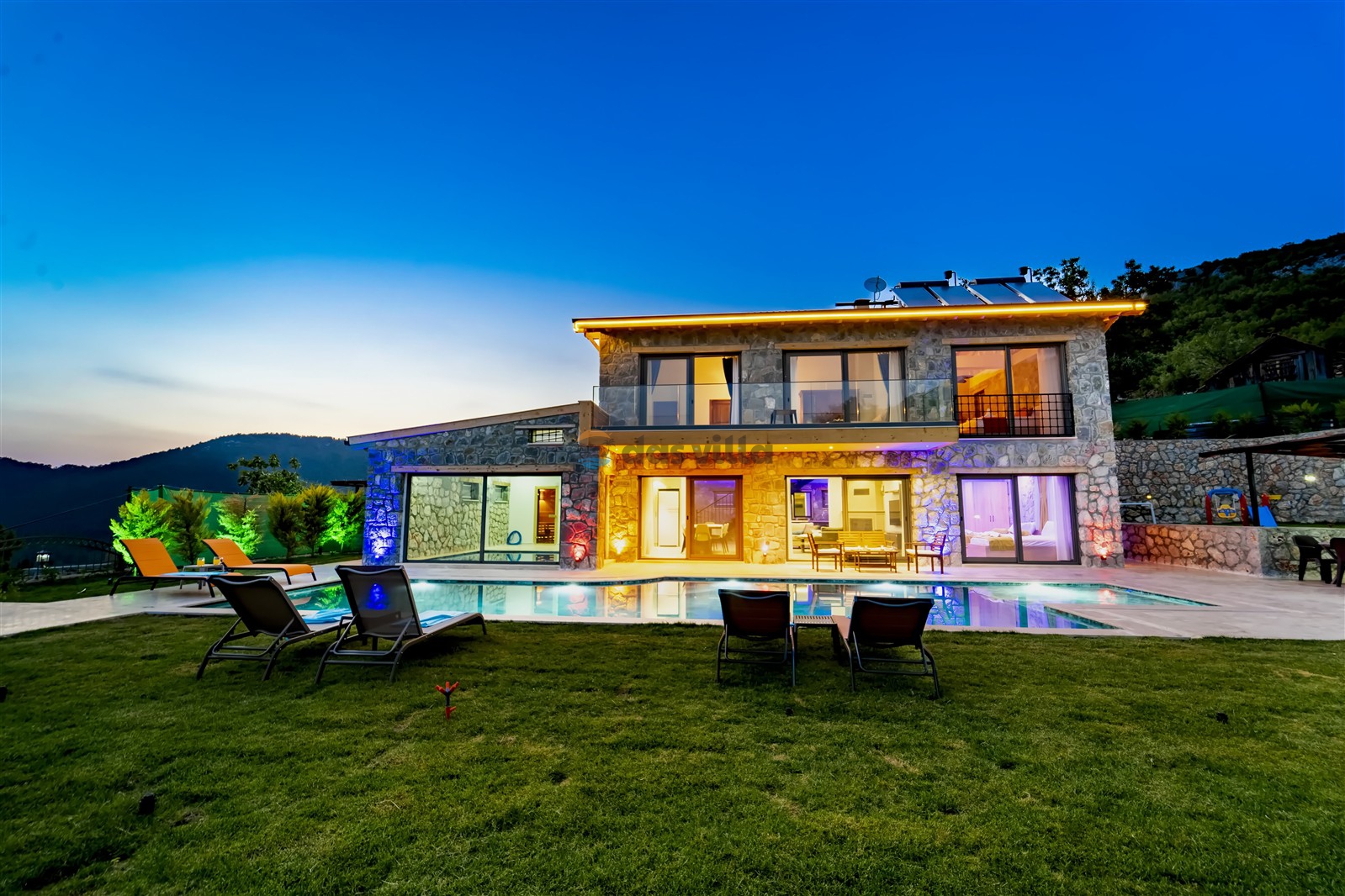 Villa Harika Seydikemer is one of our 4-bedroom villas with a capacity of 6 people, which is ideal for large families and groups of friends in Fethiye Seydikemer Bayır area. It has a private swimming pool, children's playground, barbecue and swing in its large garden, and an indoor pool, sauna, Turkish bath and jacuzzi. Due to the heating in its indoor pool, Villa Harika is also an ideal option for a winter holiday. Note: The indoor pool heating fee in our villa is an extra 700 TL per day. Guests who want pool heating must notify 2 days before the check-in date.