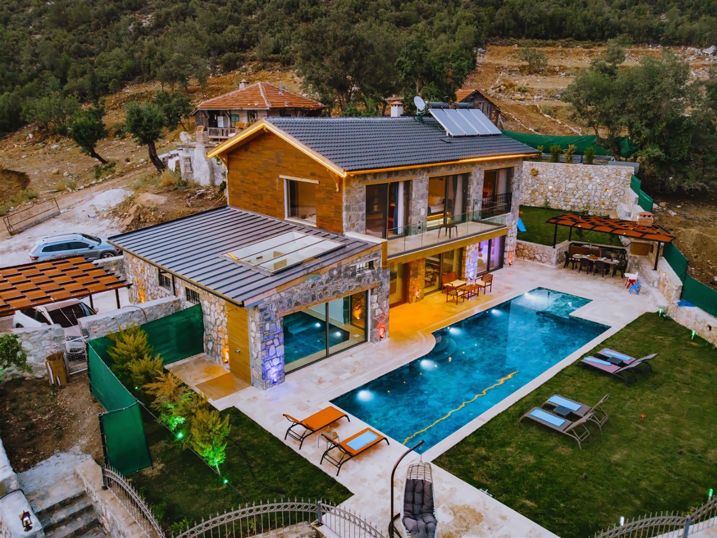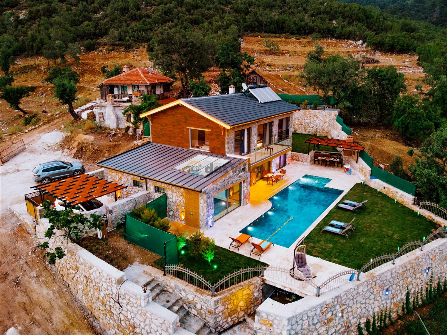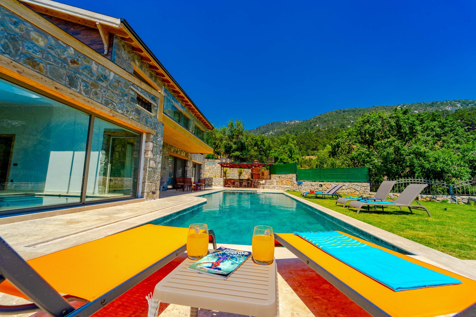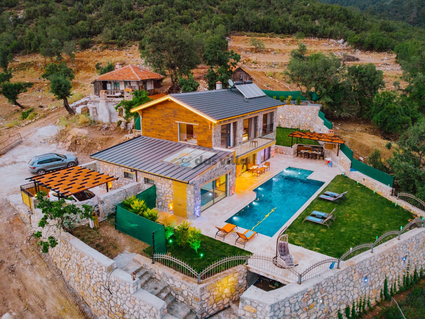 Villa Harika Seydikemer is one of our 4-bedroom villas with a capacity of 6 people, which is ideal for large families and groups of friends in Fethiye Seydikemer Bayır area. It has a private swimming pool, children's playground, barbecue and swing in its large garden, and an indoor pool, sauna, Turkish bath and jacuzzi. Due to the heating in its indoor pool, Villa Harika is also an ideal option for a winter holiday. Note: The indoor pool heating fee in our villa is an extra 700 TL per day. Guests who want pool heating must notify 2 days before the check-in date.