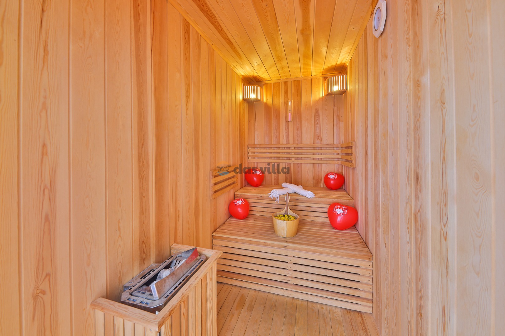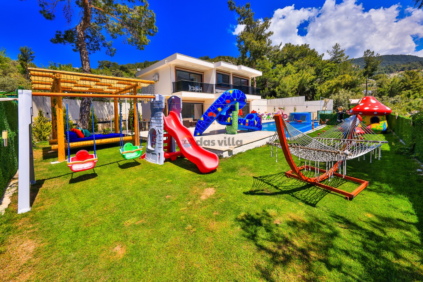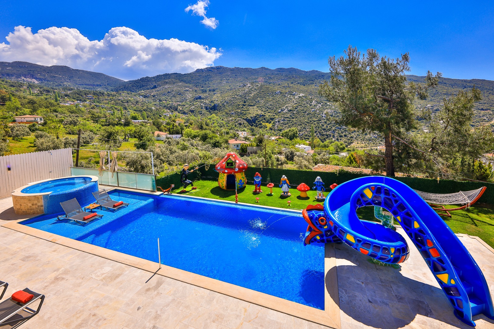 Villa Peri Masalı is a luxury rental holiday villa located in Kaş Kalkan İslamlar Mahallesi. Our 2-suite bedroom villa offers accommodation for up to 5 people. There is a double bed and jacuzzi in one bedroom, a double bed and a single bed in the other bedroom. Both bedrooms have private bathrooms, toilets and air conditioning. Our villa also has an indoor pool, sauna and Turkish bath. It offers a 12-month holiday opportunity. The garden and pool of our villa are sheltered and cannot be seen from the outside. It has a very large green area and a private swimming pool. There are activity areas such as water slides and children's playgrounds in its garden. Our villa, which is in the categories of honeymoon villa, luxury villa, sheltered villa and villa with jacuzzi, offers an ideal holiday villa option for honeymoon couples and nuclear families.