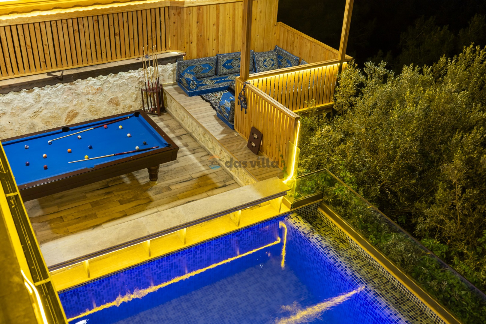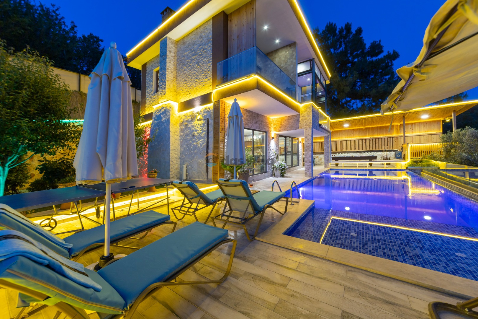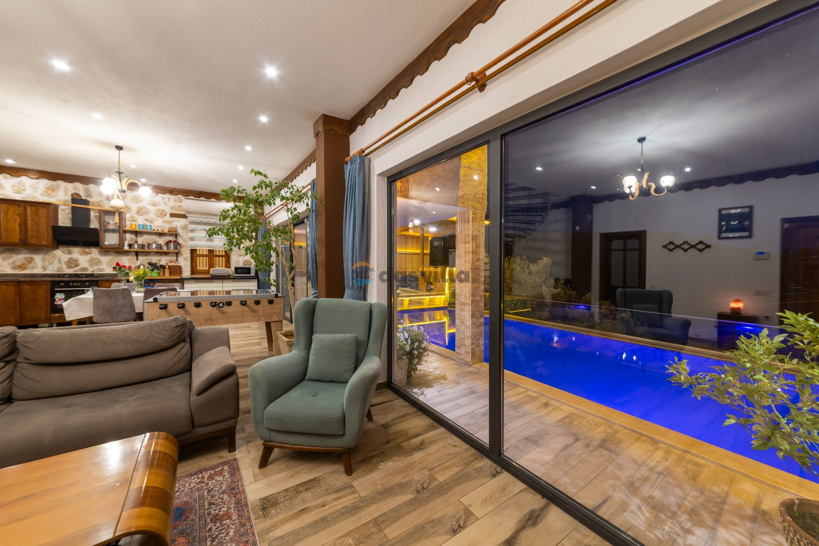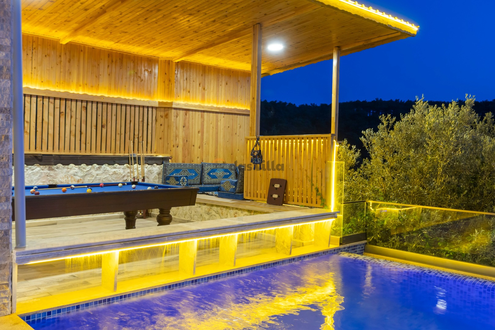 7.672 ₺Villa Şelale is a 2-bedroom 5-person jacuzzi villa located in Kalkan-Lapaz. Our villa with a magnificent nature view is conservative and cannot be seen from the outside. Our modern villa has an indoor heated pool and jacuzzi. You will never get bored during your holiday and you will want your holiday to never end. Our villa with a large garden area has table tennis, table football, children's playground, swing. Thanks to our private pool and jacuzzi, a peaceful and enjoyable holiday that will relieve the fatigue of the whole year will be waiting for you. We are waiting for you, our valued guests, in our modern villa with full equipment. Note; For our guests who want pool heating, the pool heating fee is an extra 400 TL per day.