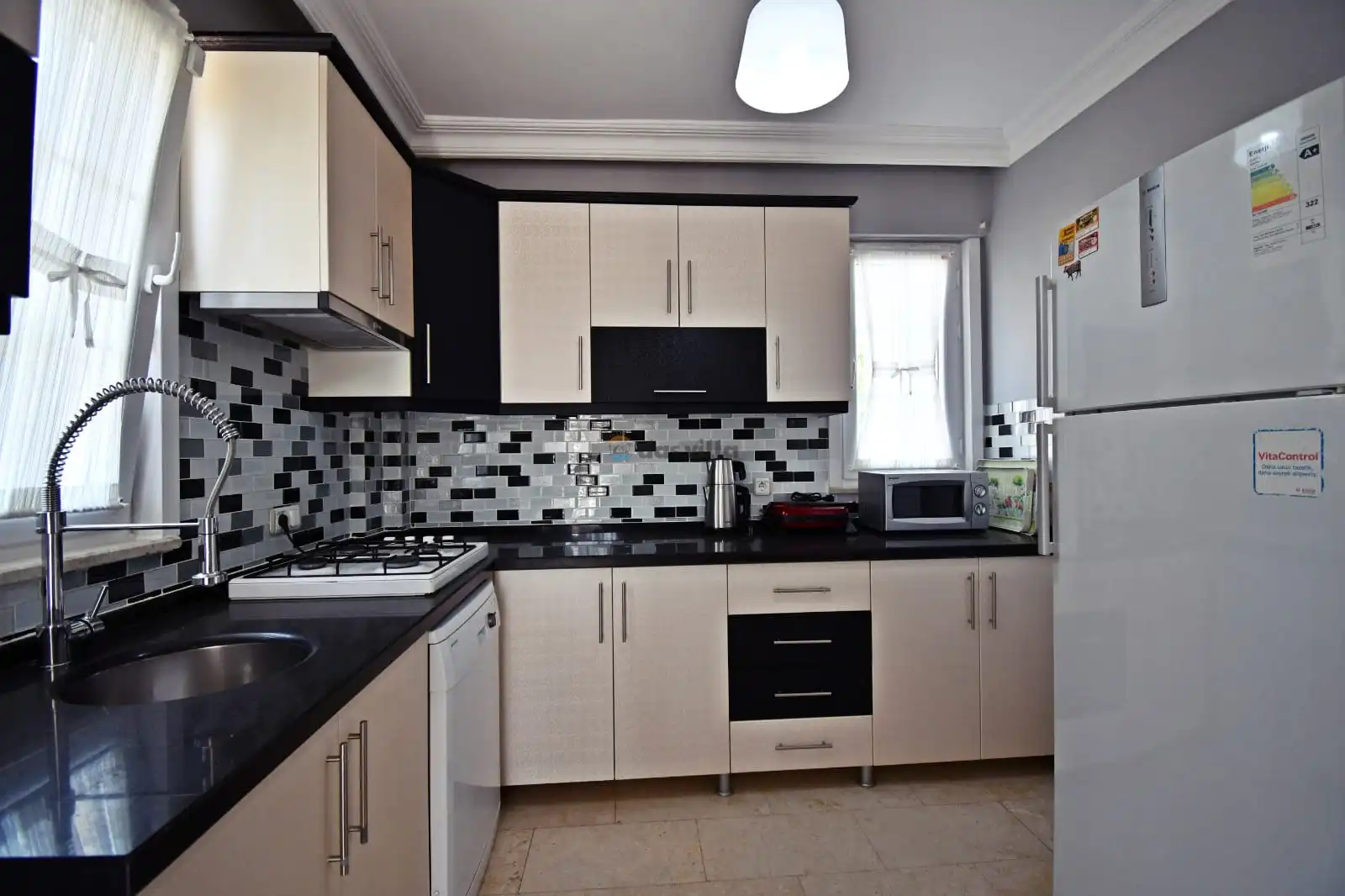 - Amerikan MutfakBulaşık MakinesiBuzdolabıFırınMikrodalga FırınAnkastre 4'lü OcakSu IsıtıcısıTencere ve Tava TakımıYemek TakımıKaşık Çatal Bıçak TakımıBardak TakımıYemek MasasıTost MakinesiÇamaşır Makinesi