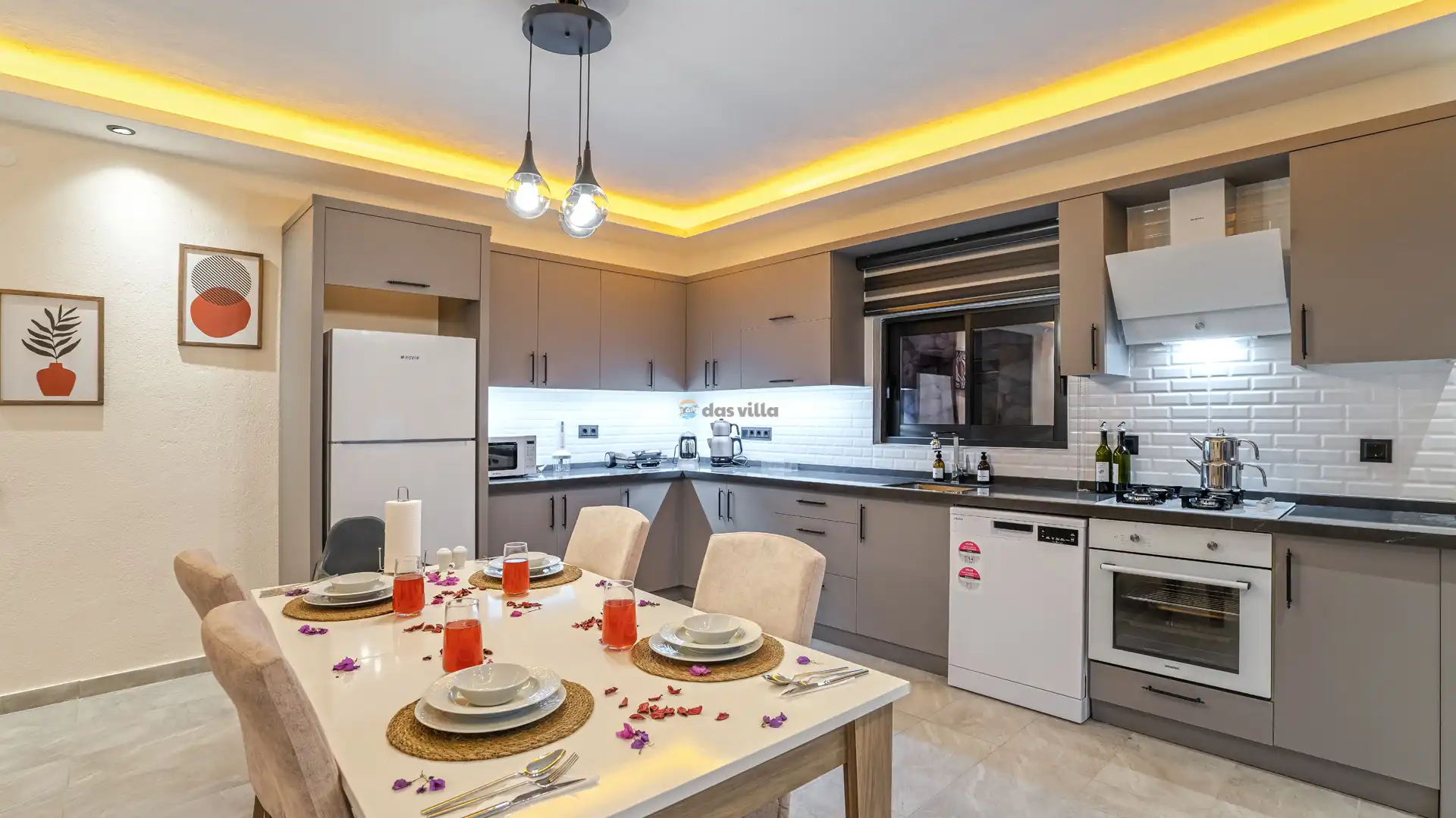 - Amerikan MutfakBulaşık MakinesiBuzdolabıFırınMikrodalga FırınAnkastre 4'lü OcakSu IsıtıcısıTencere ve Tava TakımıYemek TakımıKaşık Çatal Bıçak TakımıBardak TakımıYemek MasasıTost Makinesi