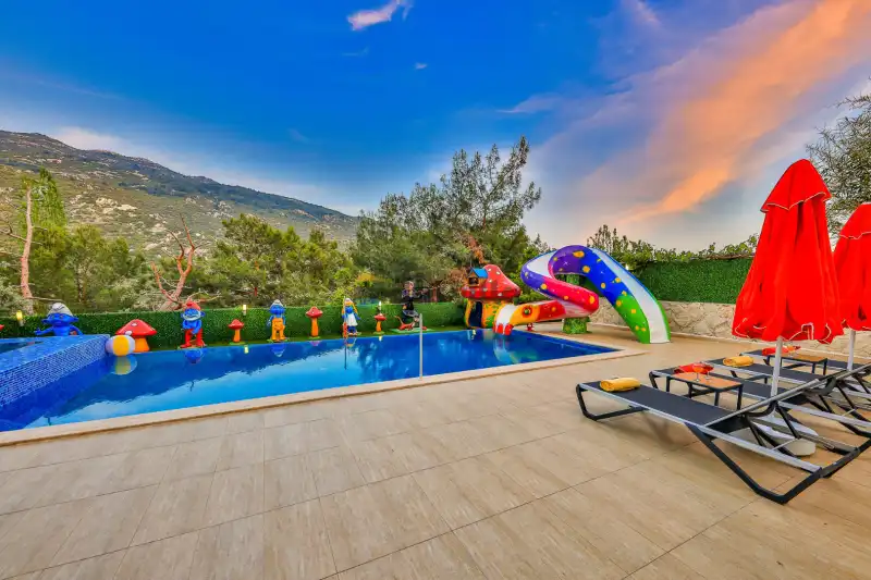 Villa Disney, Kalkan islamlar bölgesinde, 5 yatak odalı 10 kişi kapasiteli doğa manzaralı, geniş aileler ve kalabalık arkadaş grupları için oldukça ideal size özel kiralık villamız.Muhteşem doğa manzarasıyla sizlere eşsiz bir tatil sunmaktadır. Villamız muhteşem bir doğa manzarasına sahip olmakla birlikte özenli lüks dekoru ve modern tasarımı sayesinde keyifli günler geçirecek ve siz değerli müşterilerimiz tatilinizin bitmesini hiç istemeyeceksiniz. Villamızın havuz ve bahçe kısmı korunaklı olup havuz keyfini rahatça çıkarmanıza olanak sağlar. Ayrıca villamızda bulunan jakuzive size özel havuzu sayesinde keyifli bir tatil geçirirken ruhunuzu ve bedeninizi dinlendirme fırsatı bulacaksınız. Aileniz ve balayı çiftlerimiz için oldukça uygun olan modern ve özenle dizayn edilmiş villamıza siz değerli misafirlerimizi beklemekteyiz.