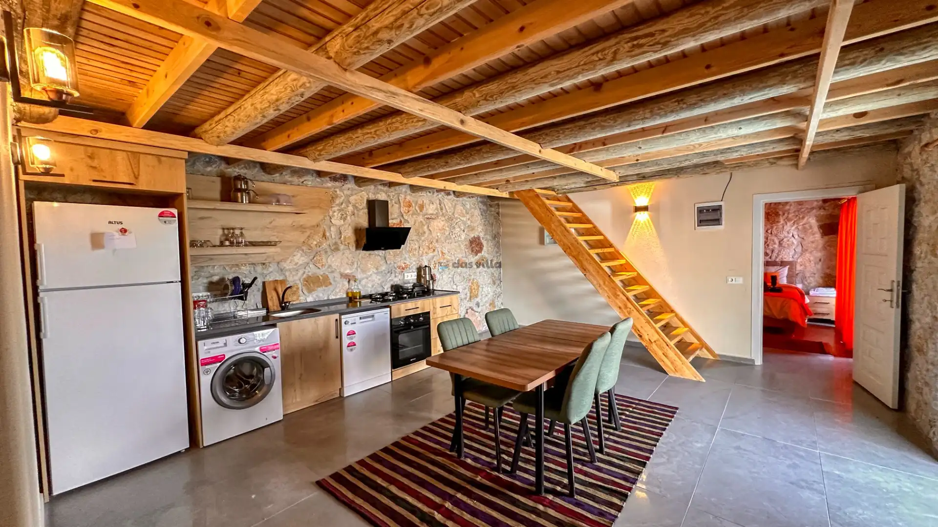 - Amerikan MutfakBulaşık MakinesiBuzdolabıFırınMikrodalga FırınAnkastre 4'lü OcakSu IsıtıcısıTencere ve Tava TakımıYemek TakımıKaşık Çatal Bıçak TakımıBardak TakımıYemek MasasıTost Makinesi
