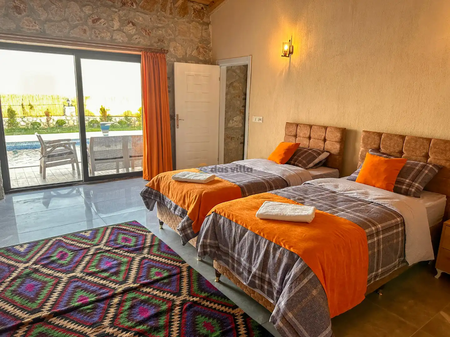 Villa İkizler 1, Fethiye Seydikemer Alaçat bölgesinde konumlanan 2 yatak odalı 4 kişi kapasiteli, doğa manzarasına sahip muhafazakar villamızdır. Çekirdek aileler ve balayı çiftleri için ideal bir tercihidir. Özel yüzme havuzu ve havuz terasında harika zamanlar geçirebileceğiniz gönlünüzce eğlenip güneşlenebileceğiniz bir ortama sahiptir. Villamızın etrafının korunaklı olması dolayısıyla havuz ve havuz terası dışarıdan gözükmemektedir.