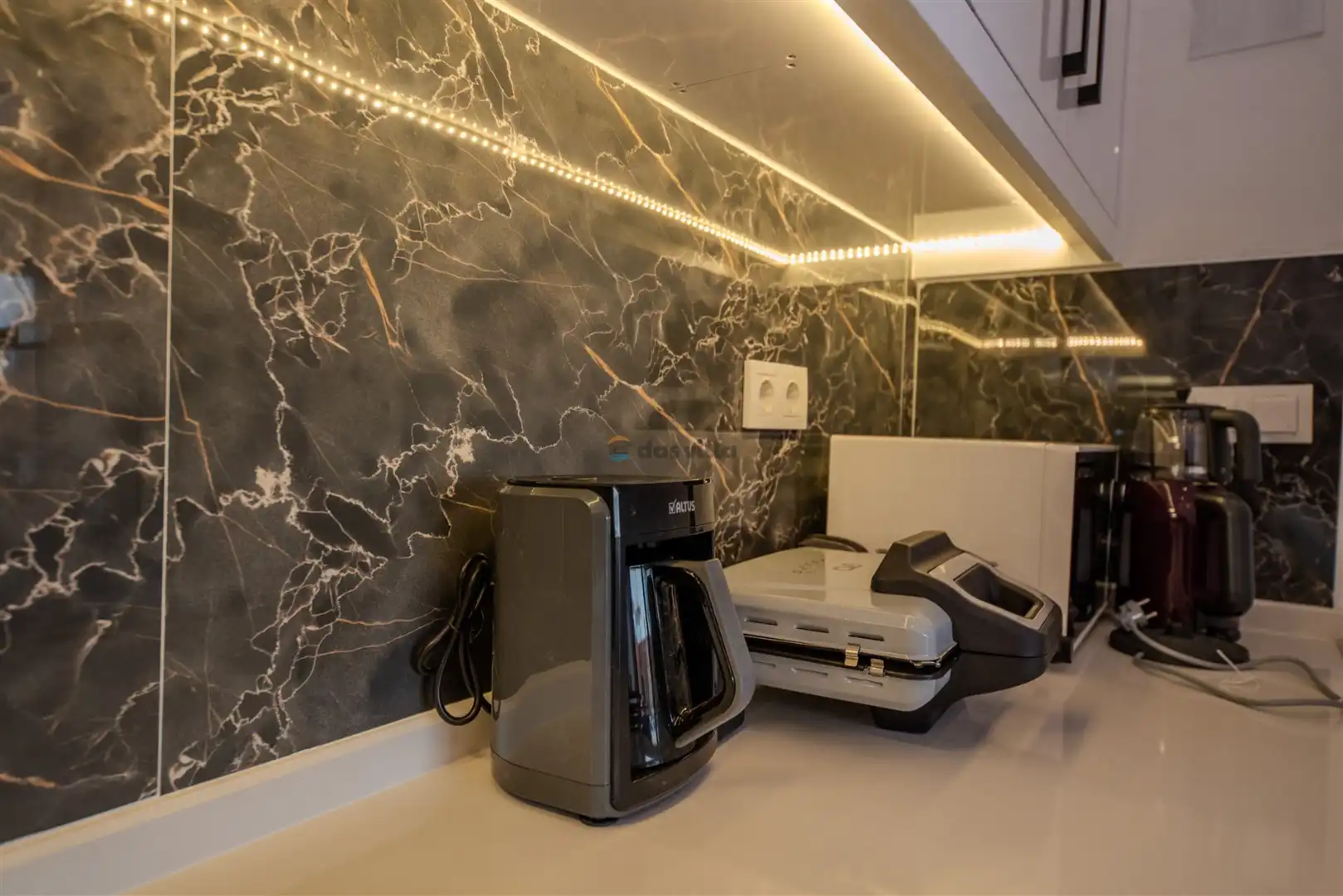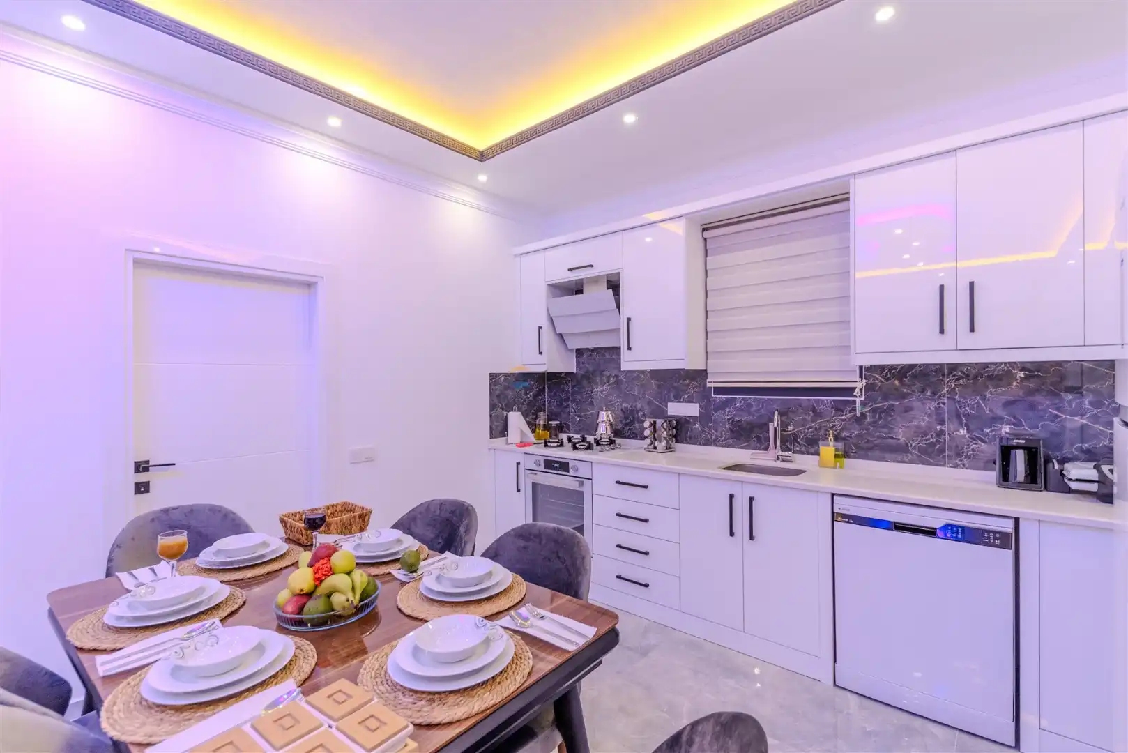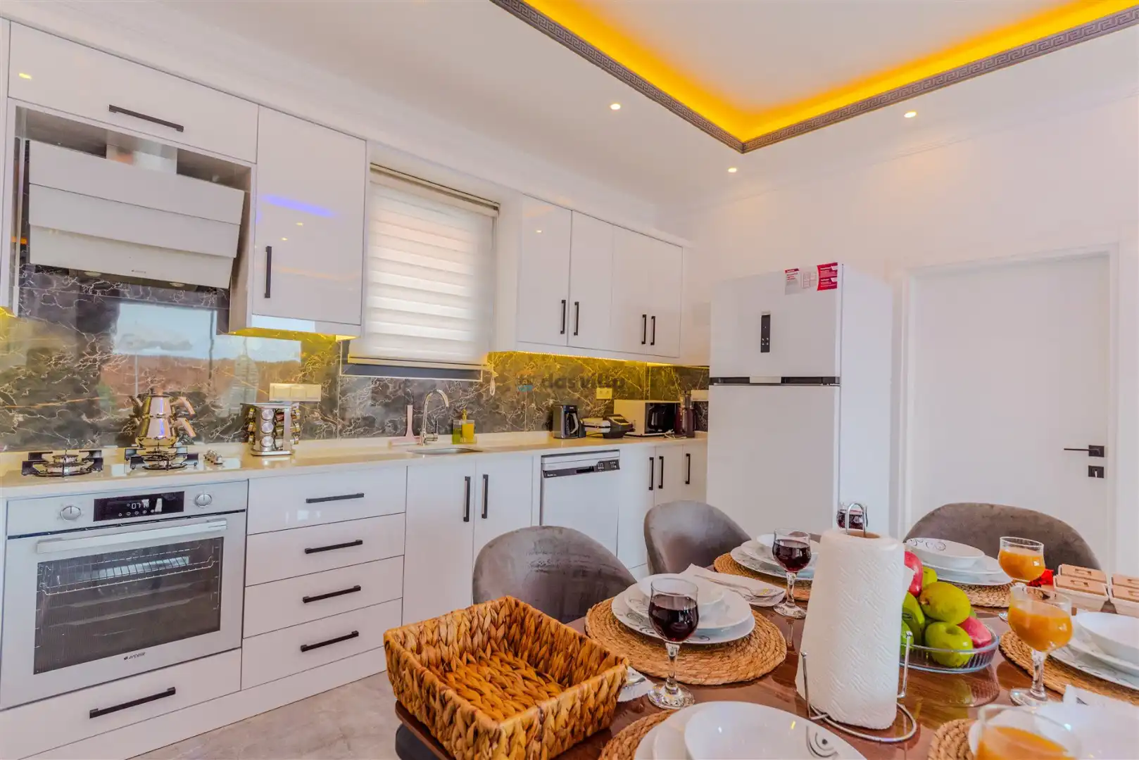 - Amerikan MutfakBulaşık MakinesiBuzdolabıFırınMikrodalga FırınAnkastre 4'lü OcakSu IsıtıcısıTencere ve Tava TakımıYemek TakımıKaşık Çatal Bıçak TakımıBardak TakımıYemek MasasıTost Makinesi
