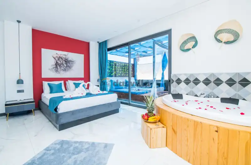 Ayrıca villamız da bulunan jakuzi, özel yüzme havuzu, çocuk havuzu ve çocuk oyun alanı sayesinde ruhunuzu ve bedeninizi dinlendirirken çocuklarınızla ve sevdiklerinizle eğlenceli ve keyifli zamanlar geçirebilme fırsatı yakalayabileceksiniz. Villamızın özel yüzme havuzunun korunaklı bir şekilde tasarlanması ise özellikle muhafazakâr ailelerimizin ve balayı çiftlerimizin memnuniyeti için yarar sağlamaktadır.