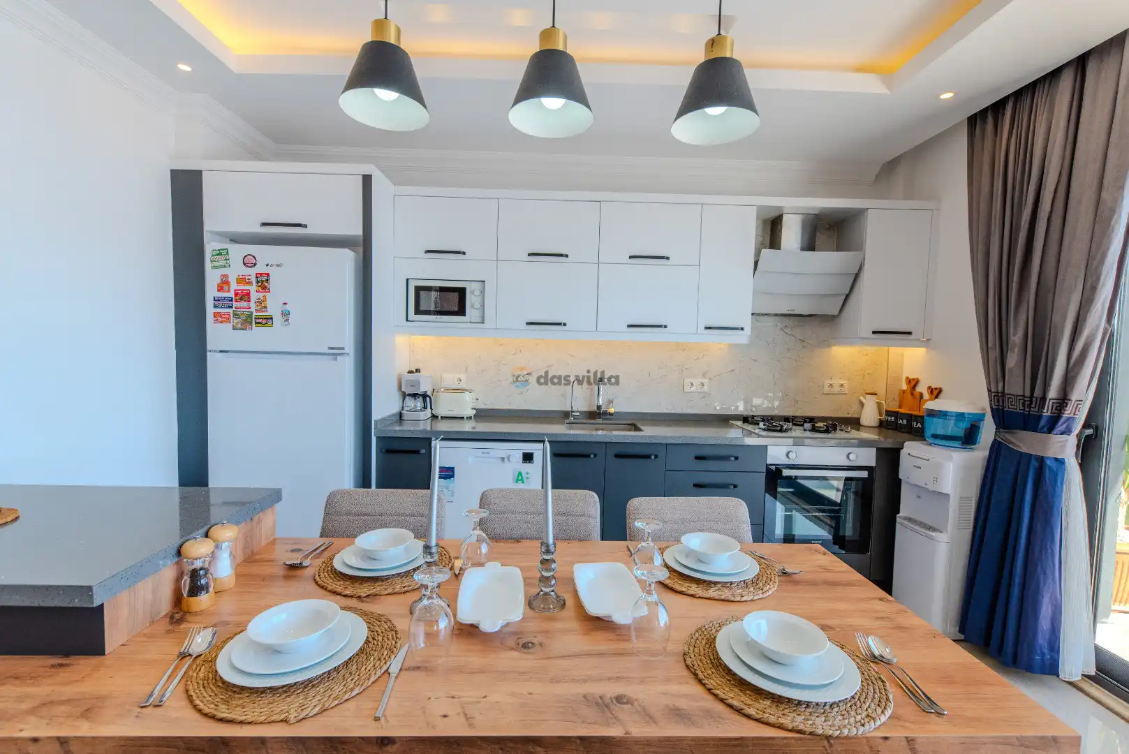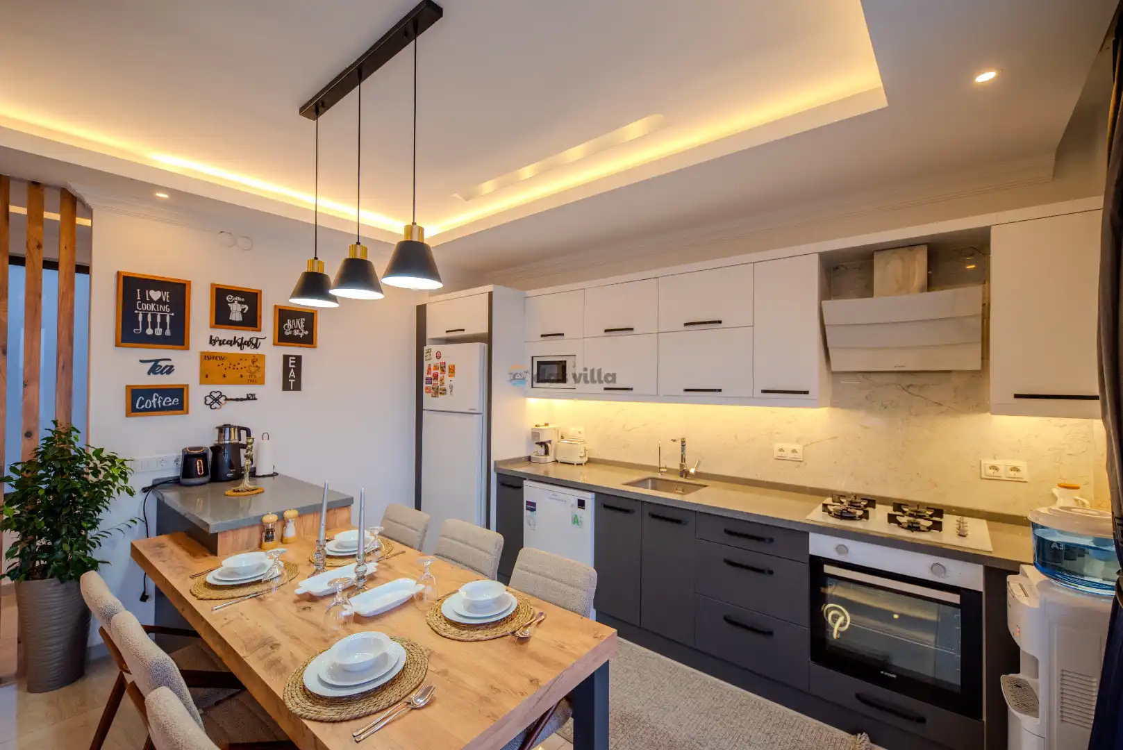 - Amerikan MutfakBulaşık MakinesiBuzdolabıFırınMikrodalga FırınAnkastre 4'lü OcakSu IsıtıcısıEkmek Kızartma MakinesiTencere ve Tava TakımıYemek TakımıKaşık Çatal Bıçak TakımıBardak TakımıYemek MasasıKahve MakinesiÇamaşır Makinesi