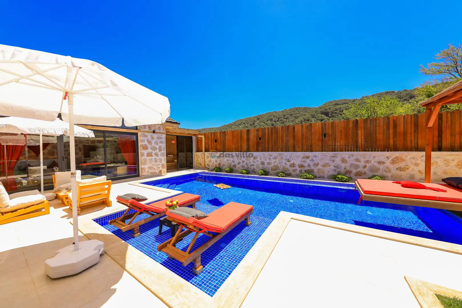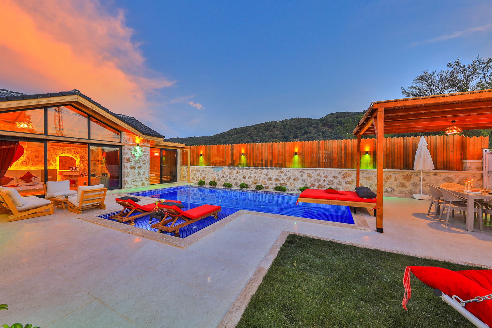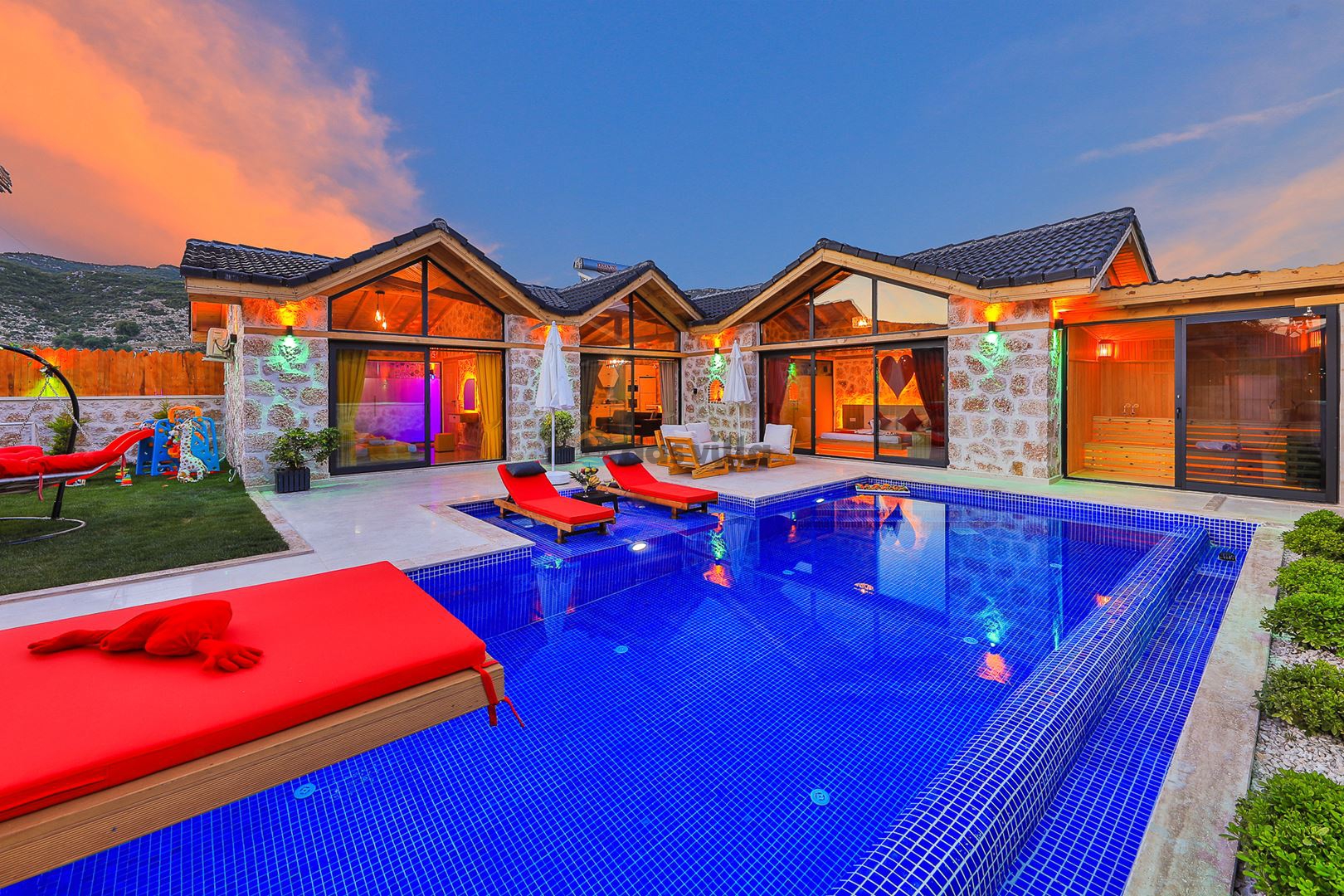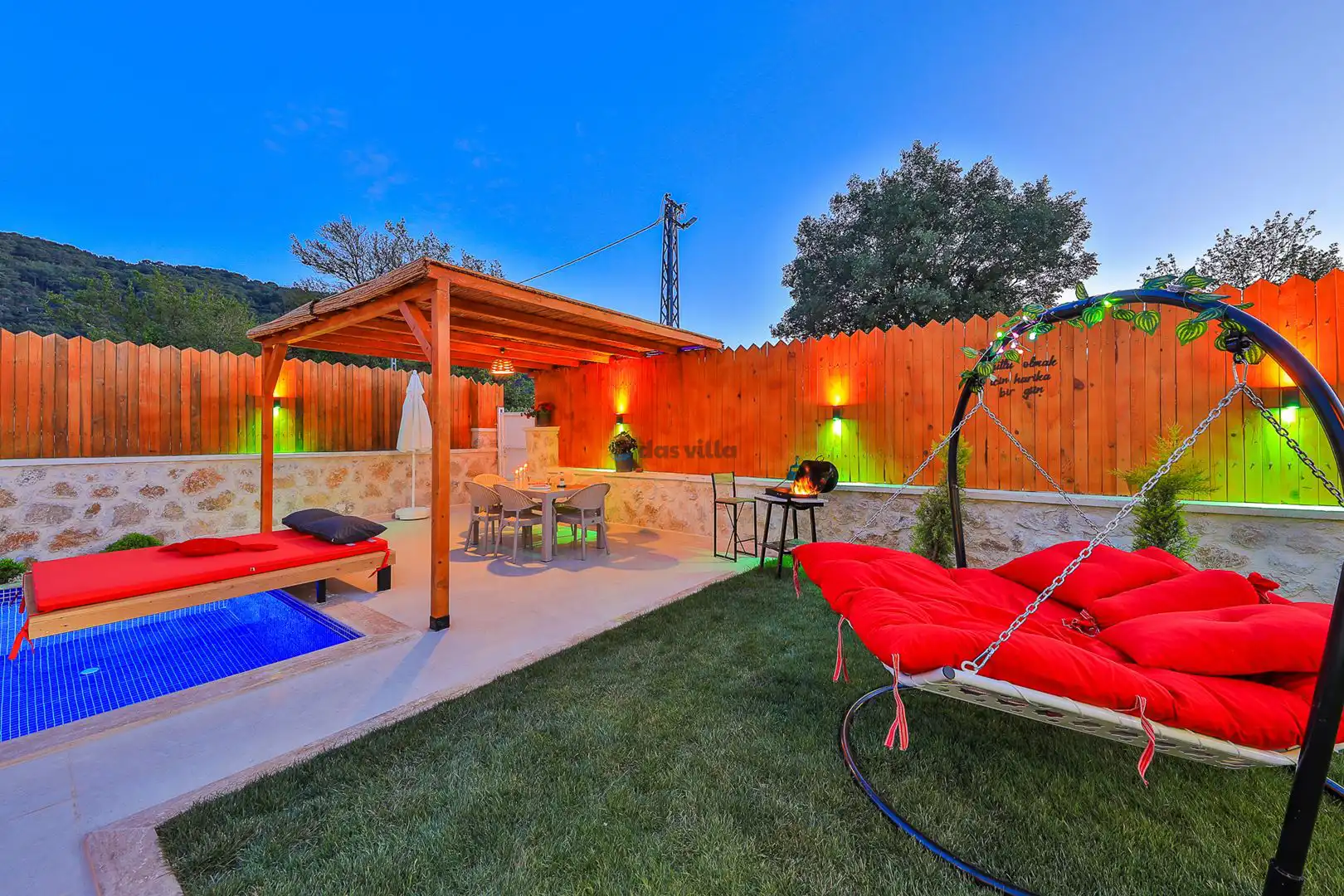 Villa Mevsim, Kalkan'ın Sarıbelen bölgesinde bulunmaktadır, 2 yatak odalı 5 kişi kapasiteli, modern dizayna sahip ve özellikle çocuklu aileler için dizayn edilmiş lüks villamız. Kalkan merkeze 15 dk mesafede olan villamız, muhteşem doğa manzarasına sahiptir. Villamızın geniş havuz terasının yanında yer alan büyük yeşil alanıhem çocukluaileler için hemde misafirlerimiz için güzel bir konfor sağlamaktadır. En ufak ayrıntısına kadar özenle dizayn edilmiş olan villamıza siz değerli misafirlerimizi beklemekteyiz.