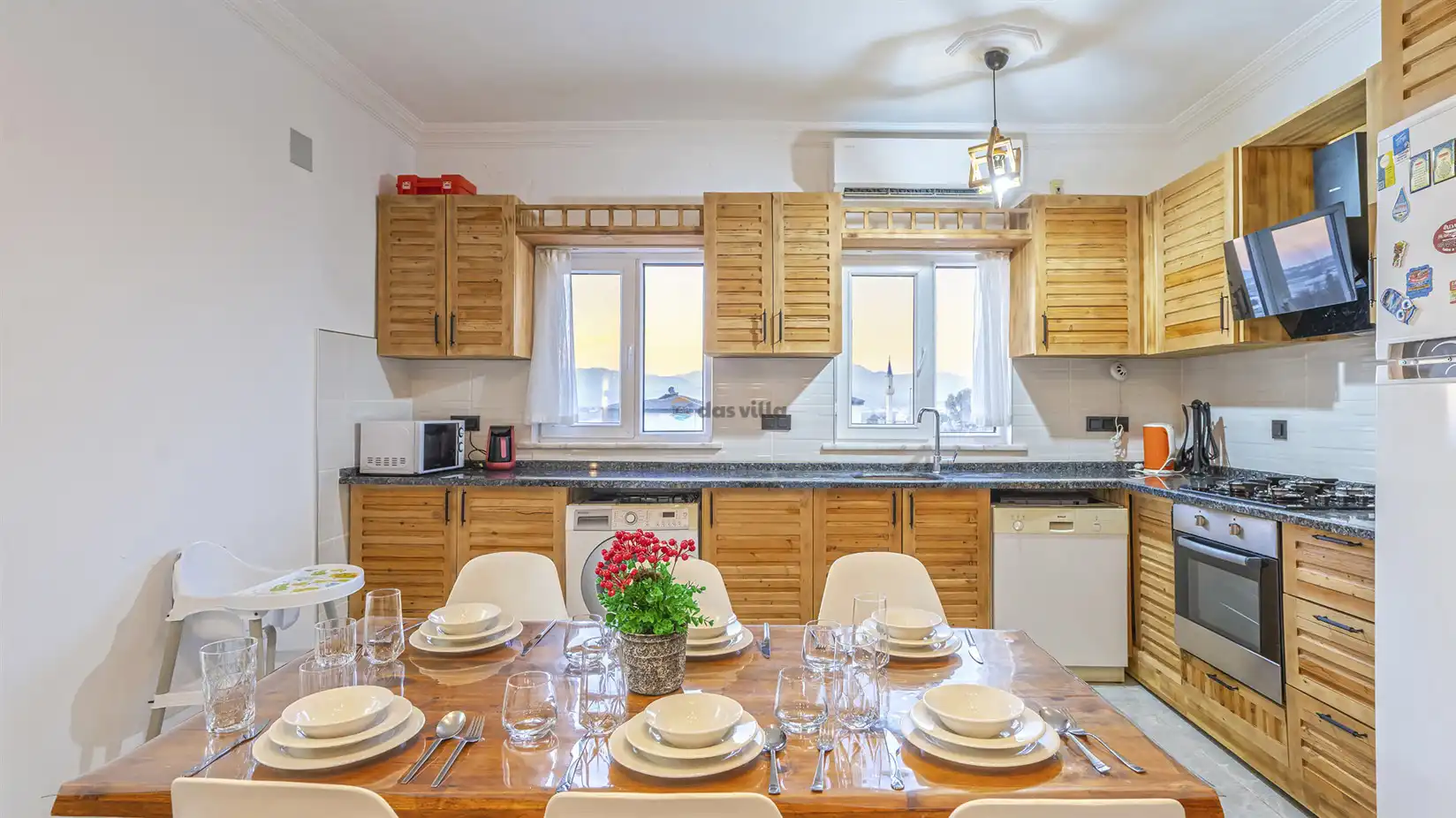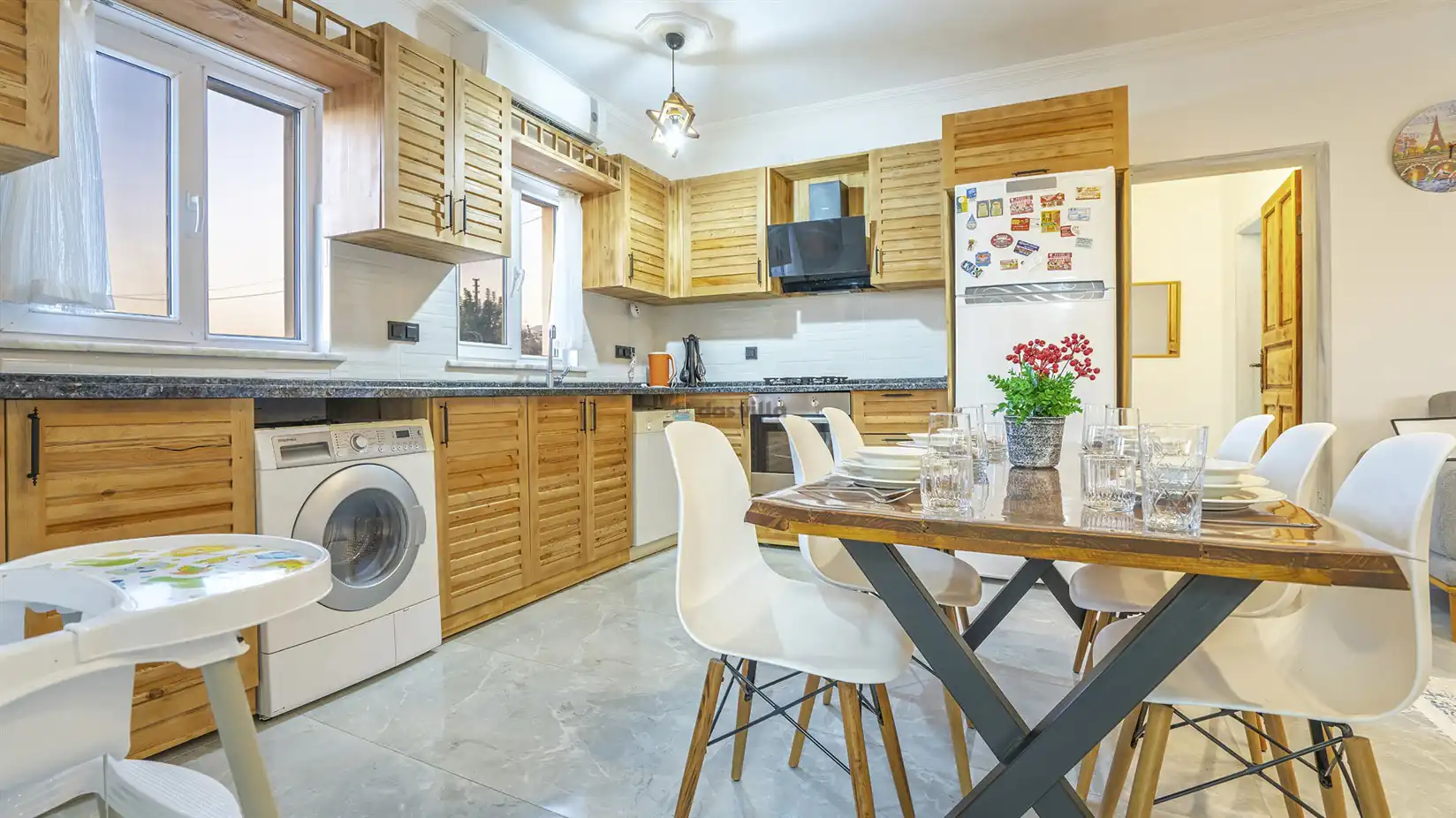 - Amerikan MutfakBulaşık MakinesiBuzdolabıFırınMikrodalga FırınAnkastre 4'lü OcakSu IsıtıcısıTencere ve Tava TakımıYemek TakımıKaşık Çatal Bıçak TakımıBardak TakımıYemek MasasıTost Makinesi