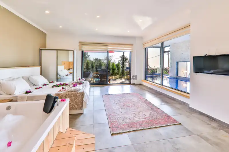 Modern villamız ultra lüks dizayn edilmiştir. Kalkan plajına ve merkeze yakın mesafededir. Villamız muhafazakar çiftler için korunaklı balayı villa katagorisinde yer almaktadır. Villamızda kapalı ısıtmalı havuz, jakuzi, doğa ve deniz manzarası bulunmaktadır
