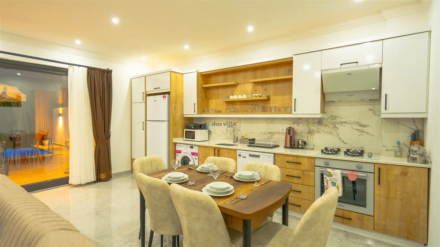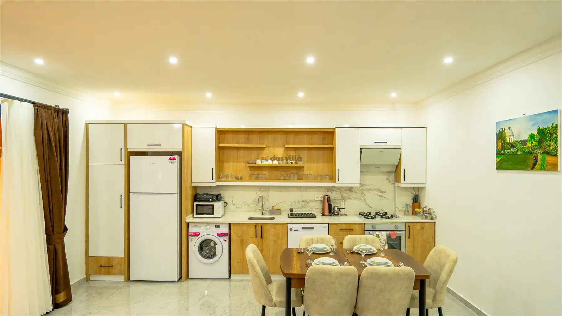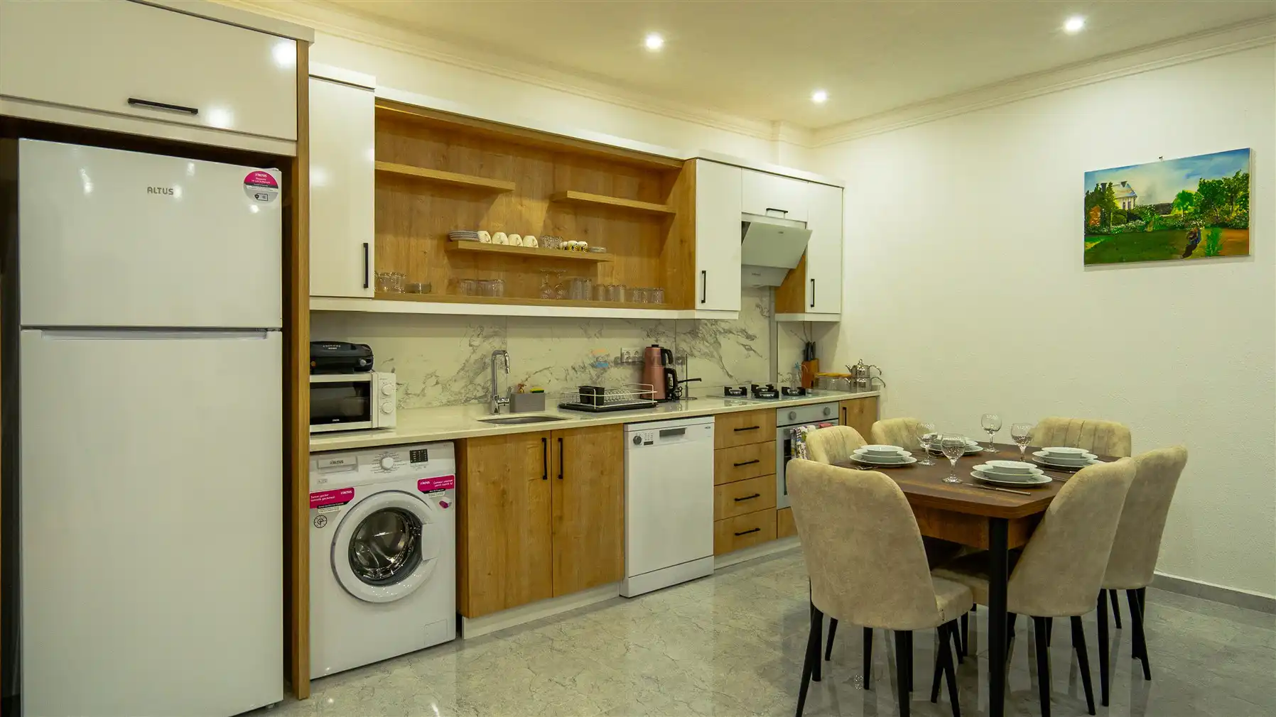 - Amerikan MutfakBulaşık MakinesiBuzdolabıFırınMikrodalga FırınAnkastre 4'lü OcakSu IsıtıcısıTencere ve Tava TakımıYemek TakımıKaşık Çatal Bıçak TakımıBardak TakımıYemek MasasıTost MakinesiÇamaşır Makinesi